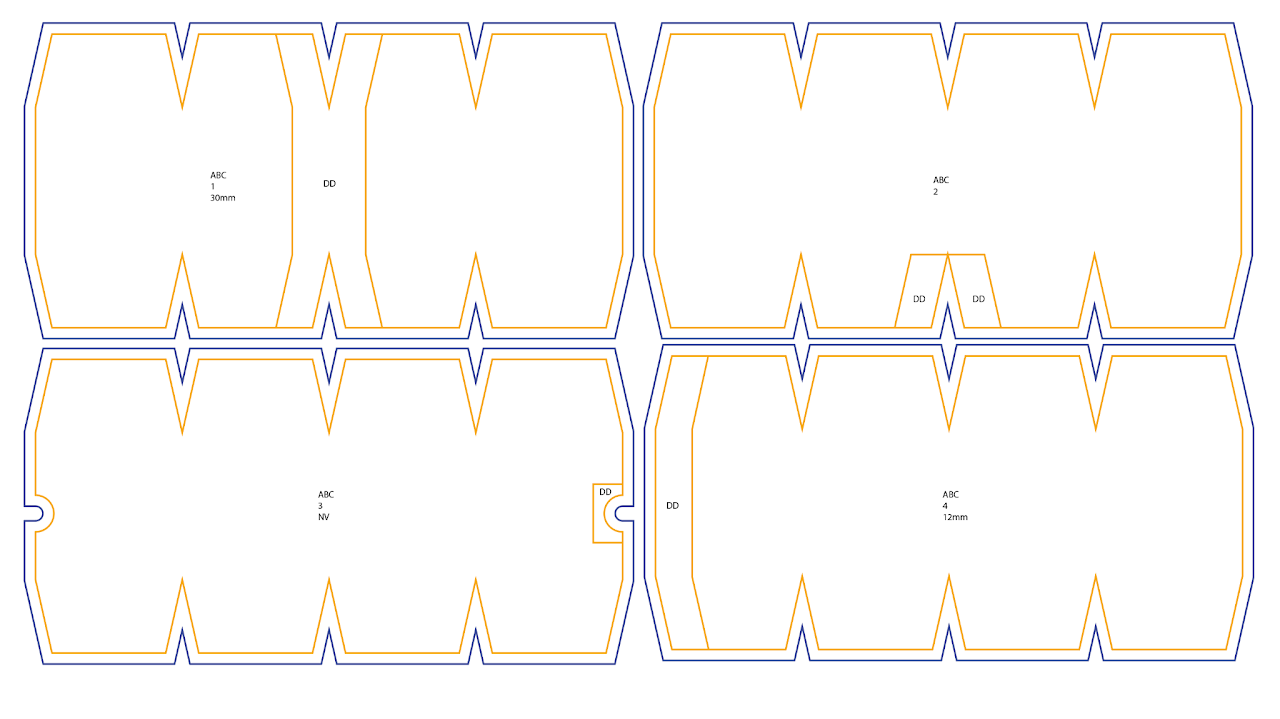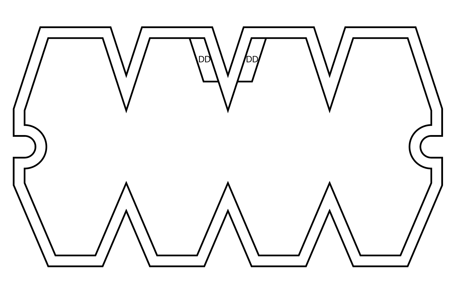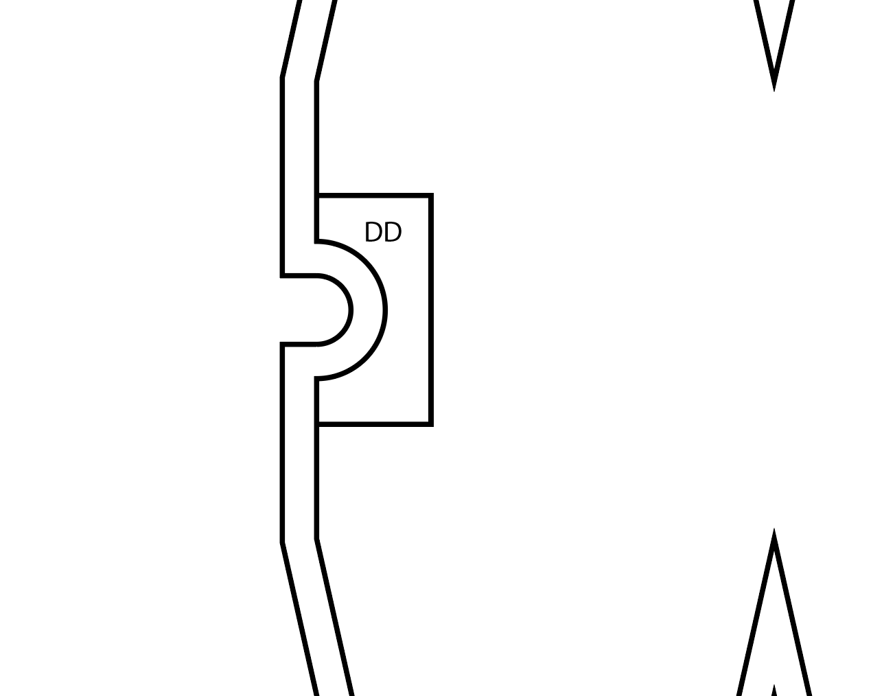 Посмотрим на чертёж на картинке. Мы видим тут DD, но он отличается от того, что мы видели ранее. Хотя принцип один и тот же: 2 сm слева и 2 cm справа, но это всё по высоте будет умещаться в 1 выточку, а не выходить за неё.