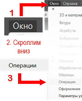 Переходим во вкладку «Окно», листаем ниже и находим «Операции», переходим туда.