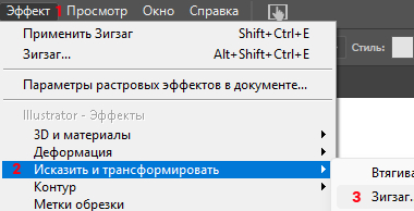 Идём дальше и теперь на верхней панели выбираем вкладку «Эффект», далее «Исказить и трансформировать» ➔ «Зигзаг».