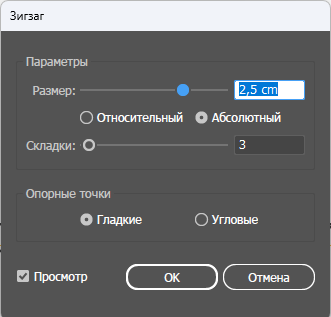 Дальше всё как и раньше: Эффект > Зигзаг > Половина от общей высоты > Нужное количество складок > Гладкие точки. Затем, не забываем: Объект > Разобрать оформление.